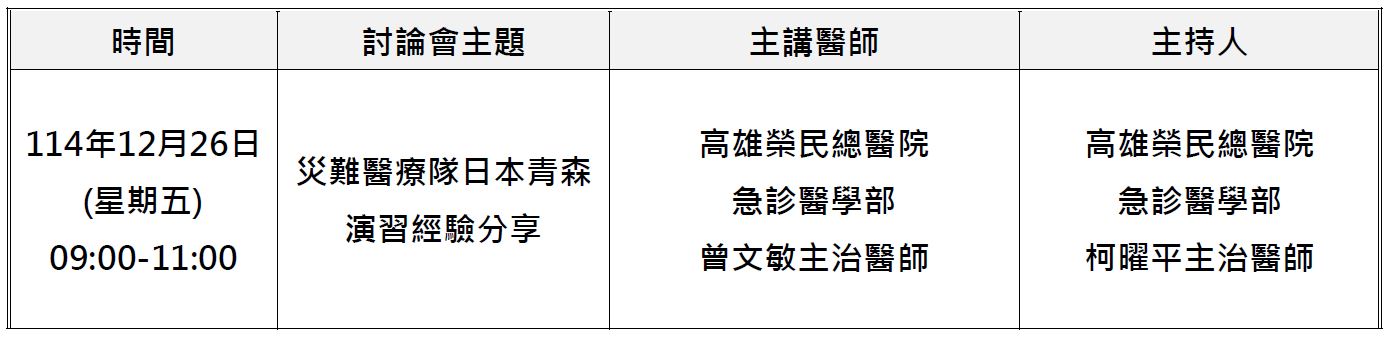 112~114度容額住院醫師「災難醫學」訓練:學會主辦之災難應變與醫療聯合討論會。