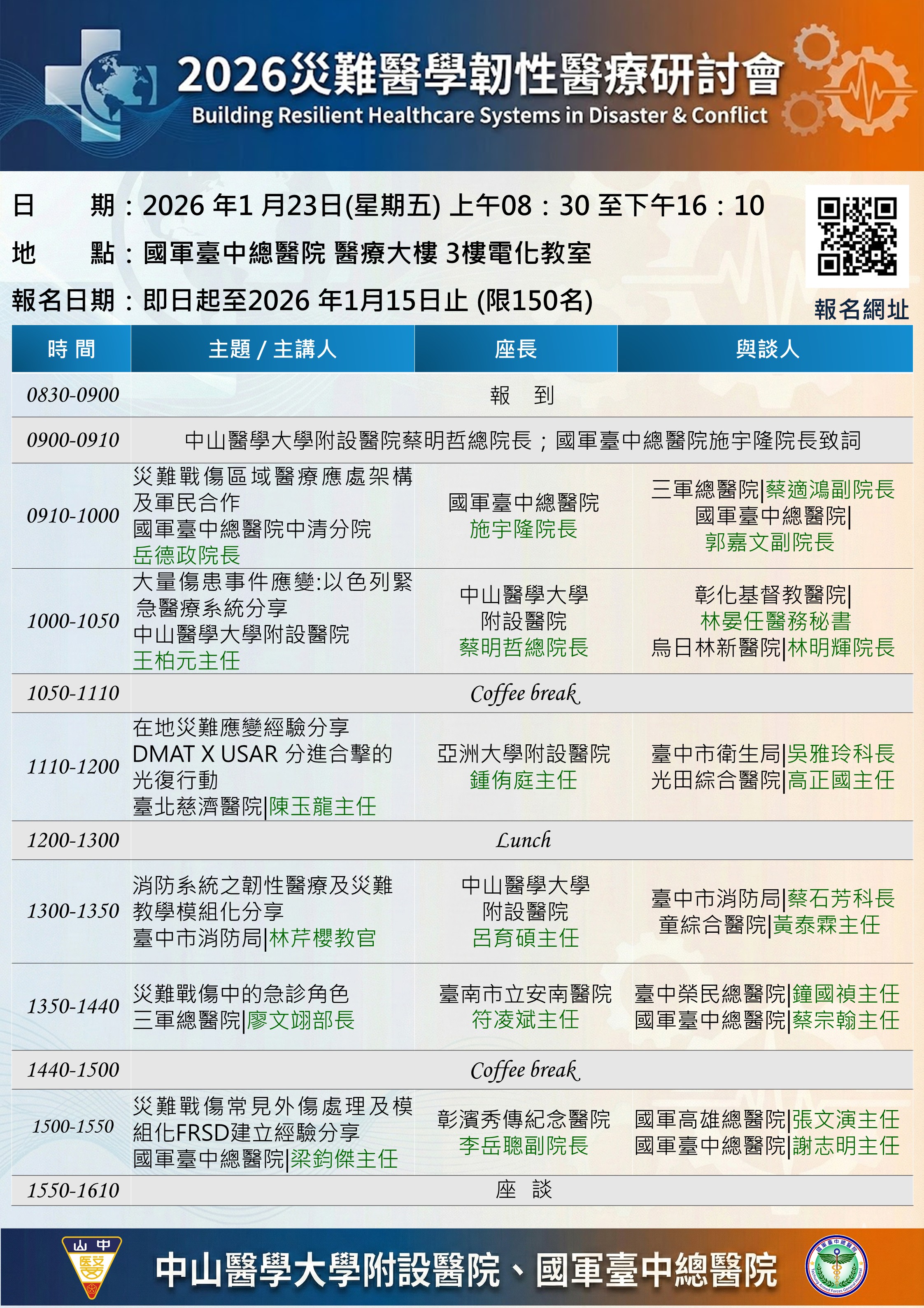 本次研討會將匯集國內急重症醫學專家、災難應變指揮官及第一線醫護人員,共同探討在資源受限環境下的醫療決策與系統韌性建立。