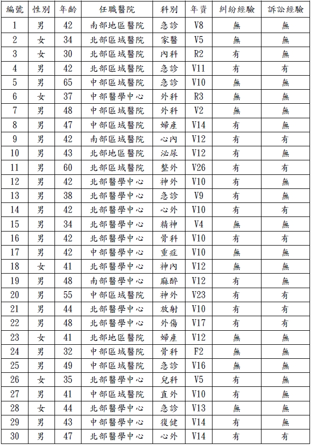 蔡依倫 童綜合醫療社團法人童綜合醫院 醫療糾紛恐懼造成醫師的心理壓力並且會影響醫師的行為,但是其本質卻未曾深入被了解。曾有質性研究訪談30位台灣各地不同科別的醫師(表一),並以「內容分析」(content analysis)的方式將訪談內容進行編碼,歸納出兩大主題與六個次主題1,2,3。研究發現,台灣醫師醫療糾紛恐懼的本質為(表二): 一、感知的負面後果(Perceived negative consequences) 無論是否曾有醫療糾紛的經驗,醫師都感受到自己如果發生醫療糾紛可能會面臨許多負面的後果,包含了訴訟、衝突情境、名譽受損和心理壓力。 1. 訴訟(Litigation) 出現最多次的主題,有29位受訪者提及擔心醫療糾紛引起的訴訟,包含: (1)刑事過程(Criminal procedures):被病家指控業務過失致死或傷害讓醫師感覺自己像做了壞事,除了要面對司法程序,如果調查結果有過失的話可能會被判刑,雖然機會極低但還是擔心自己會有牢獄之災。 (2)判決的不確定性(Uncertainty of verdicts):醫師對司法體系的信心不足,擔心自己如果有過失可能會被判天價賠償,有12位受訪者提到某位神經外科醫師被法官判賠3000萬的著名案例,他們認為這是不合理的。 (3)冗長時程干擾工作與生活(Lengthy time and work-life disturbance):官司通常耗時數年,會影響醫師的工作與生活安排。 2.衝突情境(Adversarial confrontation) 有23位受訪者提及擔心自己因醫療糾紛而面臨一些衝突的場面,包含: (1)指責或索求(Blaming or extortion):有時候病人的治療結果不佳是無法避免的,但是家屬仍然認為醫師要負道義責任而要求金錢賠償。 (2)鬧事或抗議(Riots or protects):家屬可能會在公開場合滋事或抗議表示不滿,干擾醫師的工作,對他們造成心理壓力。 (3)肢體暴力(Physical violence):雖然嚴重暴力事件在台灣很少見,但是醫師還是很恐懼肢體暴力,因為醫院的安全設備和措施通常是不足的,保安人員和警察也無法即時制止醫療暴力行為。 3.名譽受損(Reputation damage) 有18位受訪者提到如果涉及醫療糾紛可能讓自己的名譽受損,包含: (1)一般名譽或專業名譽受損(General or professional reputation damage):如果遭遇醫療糾紛,醫師擔心別人會認為自己做事馬虎或專業能力不足,也擔心主管對自己有壞印象而影響了升遷。 (2)被公眾媒體或自媒體散佈(Spreading by public media or self-media ):病家可能會以受害著的姿態找媒體或民意代表召開記者會來報導糾紛事件,也可能會在網路上針對醫師發表負面評論。 4.心理壓力(Psychological stress) 有18位受訪者提及醫療糾紛可能會給醫師帶來各方面的心理壓力,包含: (1)與院方處理態度不同調(Discordance with Hospital Management):醫師與院方對糾紛事件的處理態度或責任分配看法可能不一致,也不見得能從院方得到充足的心理、財務或法律支持。 (2)影響家庭關係或日常生活(Family relations or daily life):醫師的家人會擔心糾紛若要賠很多錢可能影響家庭的財務狀況,如果糾紛事件被公開,醫師和家人可能會常被認識的人問到此事,對他們在生活和人際互動上都形成壓力。 二、感知的風險因子(Perceived risk factors) 就算尚未發生醫療糾紛,在每天的執業或和現今的社會脈絡當中,醫師都能感受到醫療糾紛的風險。共有26位受訪者提到以下的風險因子: 1.在每日執業中(In daily practice) (1)醫療的不確定性(Medical uncertainty):很多醫療處置都有不確定性, 即使醫師沒有犯錯,只要病人治療結果不好,家屬仍可能認為是醫師有疏失而引發醫療糾紛。 (2)工作量過多(Work overload):醫院因為成本考量而使得醫護人員的工作 量過多和人力不足,這可能會造成一些醫療錯誤和溝通不良的情形,而這兩者正是形成醫療糾紛的兩大因素, 2.在社會脈絡中(In social context) (1)全民健保的影響(In fluence of the National Health Insurance):全民健保用總額方式控制醫療支出的費用,並且以低於市場的價格論量計酬。醫師為了維持收入而增加工作量,這可能會影響看診的品質。出於財務考量,健保給付的醫材品質不一定是最好的,這也會影響治療或手術的結果。 (2)醫病關係弱化(Weakened physician-patient relationship):病人對醫療的 期望變高,對不確定性的容忍度變低,因此當治療結果不佳時,醫病之間很難形成同盟關係一起去面對。 結語 除了訴訟與法律層面,醫療糾紛恐懼還包含了許多其他的負面後果。醫師在每日執業與現今的社會脈絡中,也隨時能感受到醫療糾紛的風險。除了相關法律條文,政府也應著手改革健保制度以提升醫療品質,減少醫療糾紛。醫院則應設立明確的糾紛調解機制,強化醫院的安全措施,並在糾紛發生時即時提供心理輔導與其他相關協助。 表一、受訪者一覽表1