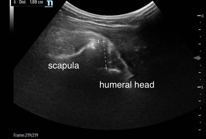 圖片4、70歲女性右肩關節前脫位復位後以三角巾固定之肩部X光 肩關節積液 (shoulder effusion) 肩部疼痛和腫痛的其中一個原因是關節積液或是外傷所致關節積血,超音波評估時可以由前側或後側來檢查,觀察到積液不一定就是主要的問題,一定要配合病史和理學檢查來綜合評估。