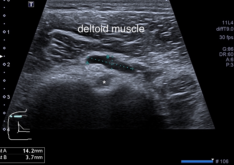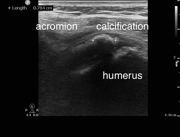 圖片5、42歲男性,右肩疼痛。超音波標示為SASD bursitis (subacromial-subdeltoid bursitis, 肩峰下-三角肌下滑囊炎)。 星號標註為二頭肌長頭肌腱(LHBT - long head of biceps tendon) 影片6、42歲男性,右肩疼痛。超音波影片所見積液在LHBT上方,為SASD bursitis 影片7、42歲男性,右肩因SASD bursitis致疼痛。超音波導引滑囊積液抽吸 個案:56歲女性,右肩外側疼痛4天。無明顯紅腫。生命徵象穩定,急診就診前一天有些微發燒,理學檢查右肩外側一處明顯壓痛,右上臂無法上抬。超音波影像上看到肩關節少量積液(影片8、影片9),但主要疼痛部位在棘上肌腱上的鈣化病變 (圖片6、圖片7)。在超音波導引下我們為該患者進行治療 (影片10),患部疼痛立即得到緩解後自急診出院,安排後續復健科追蹤。 影片8、56歲女性,右肩疼痛數日。超音波影像可見LHBT旁少量的關節積液 影片9、56歲女性,右肩疼痛數日。超音波影像可見盂肱關節後側少量的關節積液
