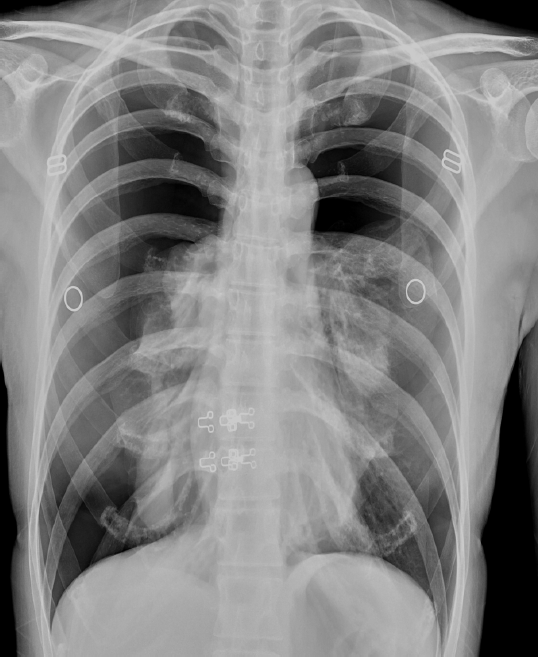 圖一、(左側) 胸腔X光:雙側氣胸。 本圖取自臨床圖片,去病人資訊授權重製經期性氣胸