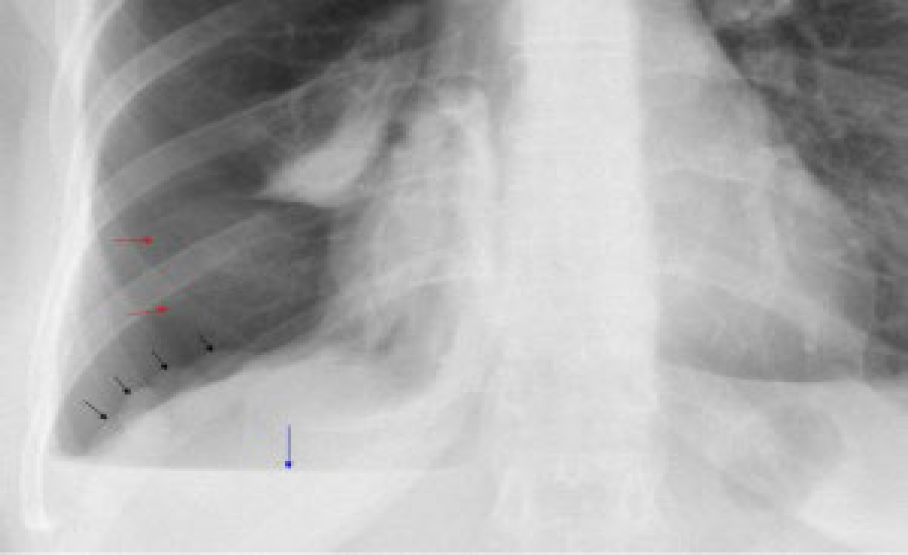 圖三、胸腔X光可能可以看到橫膈膜上多個小結節(圖三黑色箭頭) (圖片來源: Catamenial pneumothorax. J Thorac Dis. 2014;6(S4):S448-S460. )