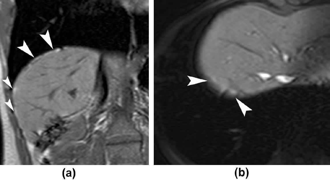 圖五、核磁共振的T1-weighted可以看到訊號增強的病灶 (圖片來源: Thoracic endometriosis syndrome: CT and MRI features Rousset, P. et al. Clinical Radiology, Volume 69, Issue 3, 323 - 330)