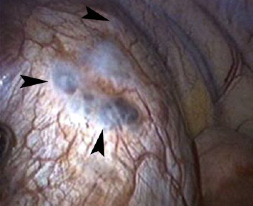 圖六、胸腔鏡手術可以看到橫膈膜結節 (圖片來源: Thoracic endometriosis syndrome: CT and MRI features Rousset, P. et al. Clinical Radiology, Volume 69, Issue 3, 323 - 330)