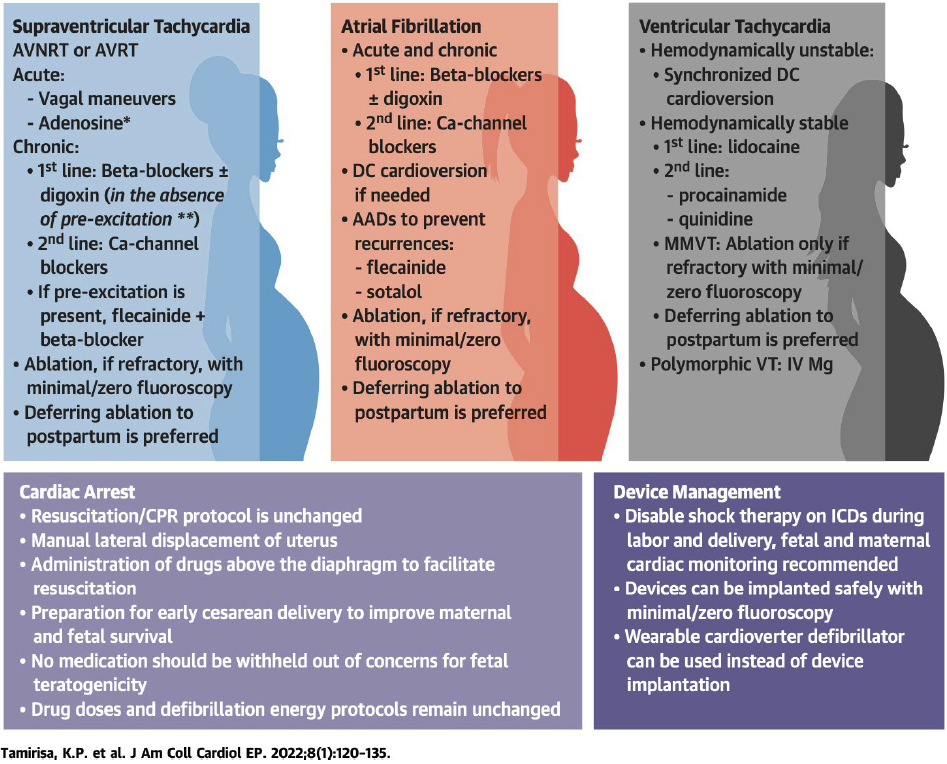 (圖片來源: Tamirisa K.P. et al. J Am Coll Cardiol EP. 2022;8(1):120-135.) 4. ICD (Implantable cardioverter-defibrillator) - 已經放置ICD者妊娠期間仍可安全使用 - 若在生產時建議在有其他心率監測儀器下,先關閉ICD電擊功能,因可能會對於宮縮oversensing 5.電擊整流 電擊能量從50J-400J目前沒有看到造成胎兒副作用的證據,且成功率超過90%;整流時因羊水會傳導,建議在胎兒監測下電擊。 避免藥物 - Amiodarone:顯著副作用,包含胎兒甲狀腺素低下、生長遲緩、早產 - Diltiazem:胎兒生長遲緩、動物實驗中曾出現發育異常 - Atenolol:胎兒生長遲緩、胎兒心搏過慢