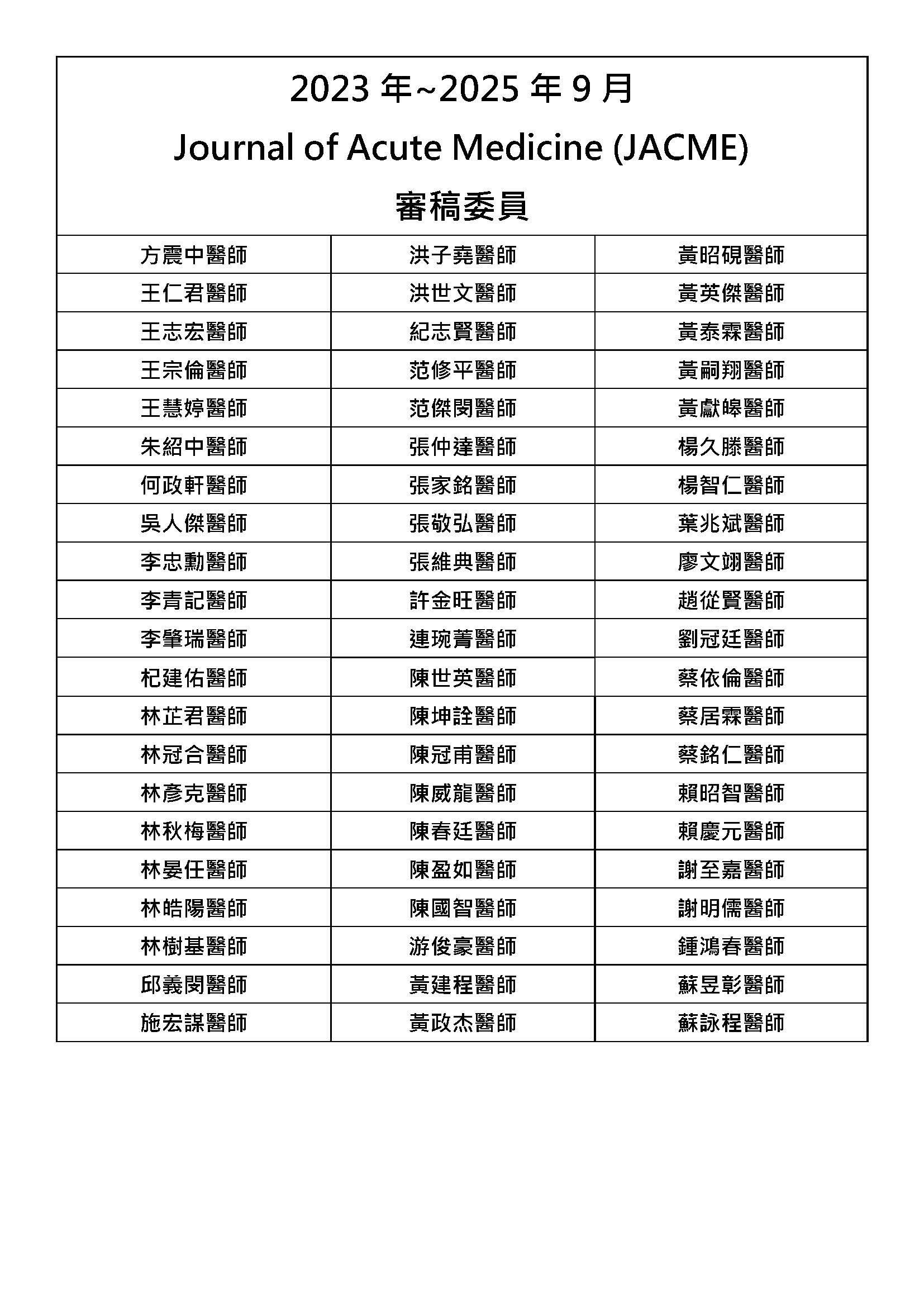 《Journal of Acute Medicine》編輯部感謝審稿委員撥空協助審查稿件,並以專業知識與經驗提供寶貴意見。您的參與不僅提升了稿件的品質,也讓審稿過程更加完善。再次感謝您的支持與付出,期盼未來能繼續獲得您的協助。